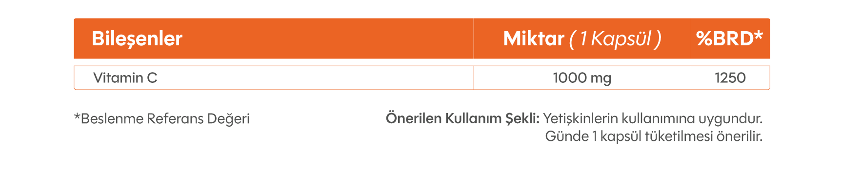 C vitamini bağışıklık sisteminin normal fonksiyonuna, yorgunluk ve bitkinliğin azalmasına katkıda bulunur.