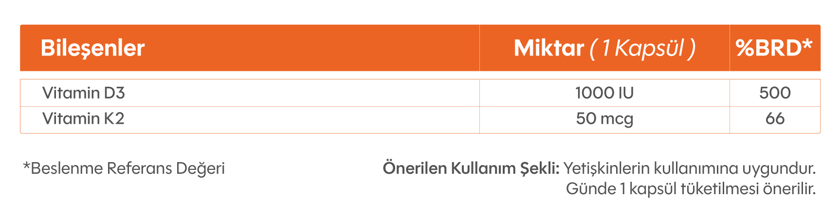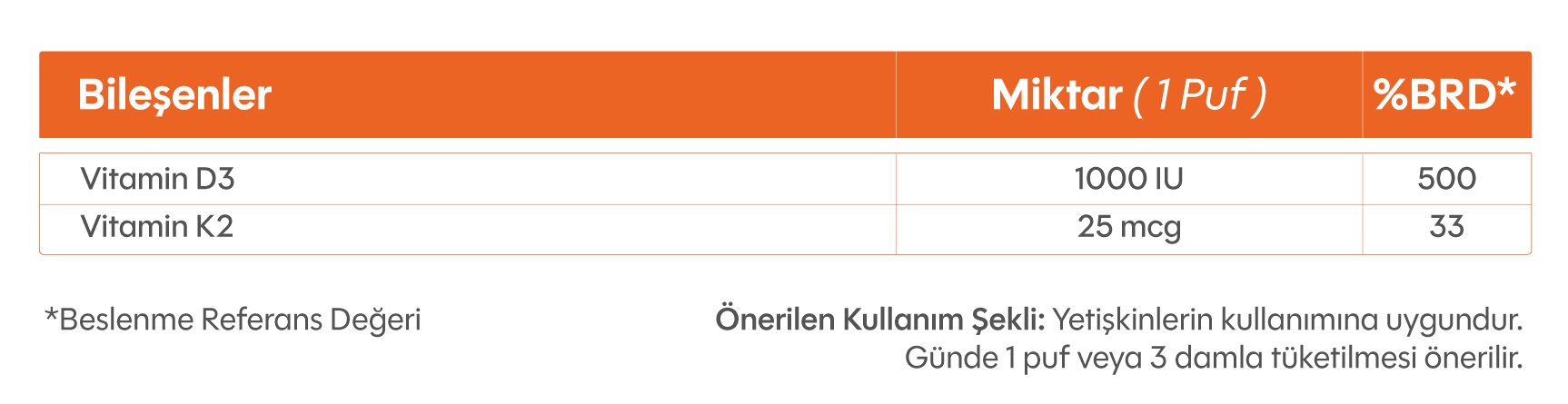 Suda Vitamin D3K2 içerisinde bulunan D vitamini sayesinde bağışıklık sisteminin normal fonksiyonuna, K vitamini sayesinde de normal kemiklerin korunmasına katkıda bulunur.