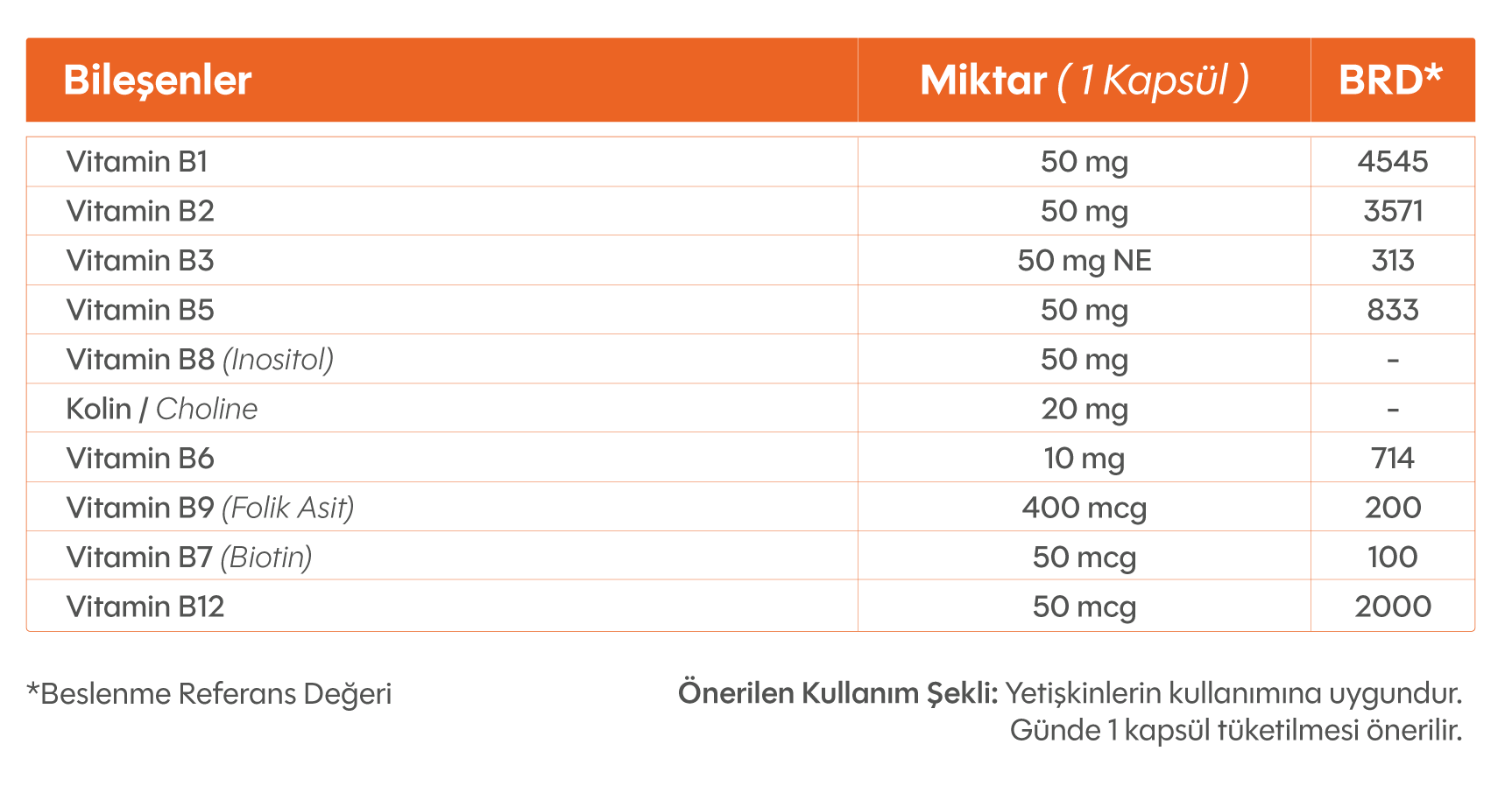 Suda Vitamin B-50 Complex içerisinde; tiamin, riboflavin, niasin, pantotenik asit, piridoksin, biotin, inozitol, folik asit, kobalamin ve kolin bulunduran yetişkinler için geliştirilmiş bir gıda takviyesidir.