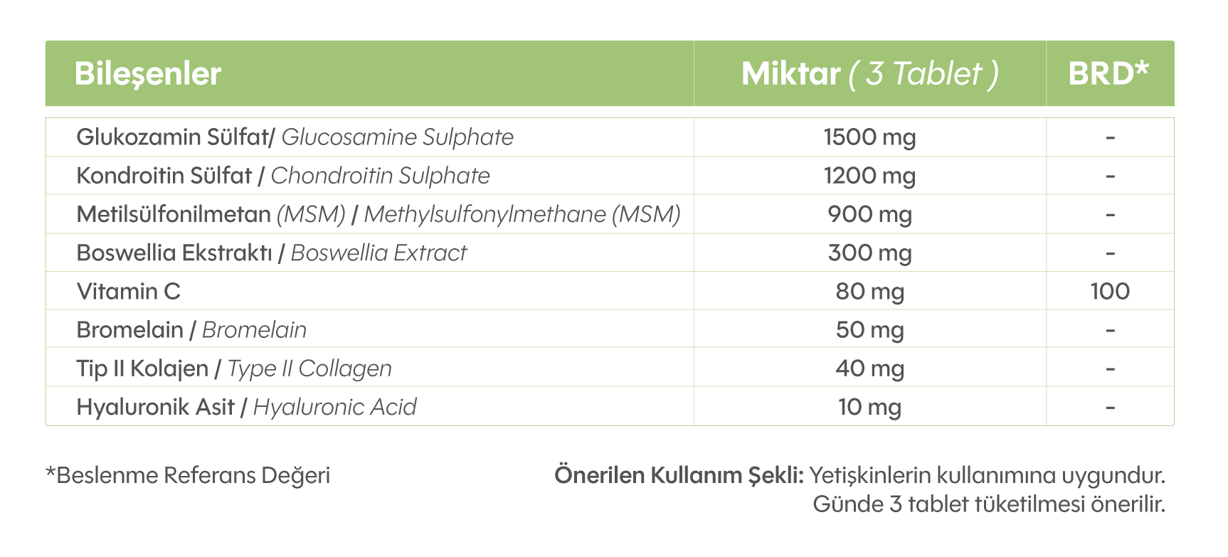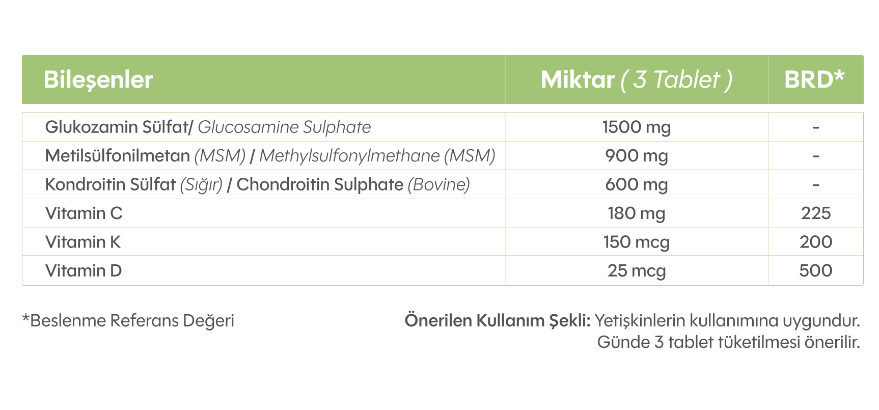 Suda Glucosamine Chondriotin with MSM Vitamin K2 içerisinde glukozamin sülfat, kondroitin sülfat, msm, vitamin c, vitamin k ve vitamin d bulunduran yetişkinler için geliştirilmiş bir gıda takviyesidir.