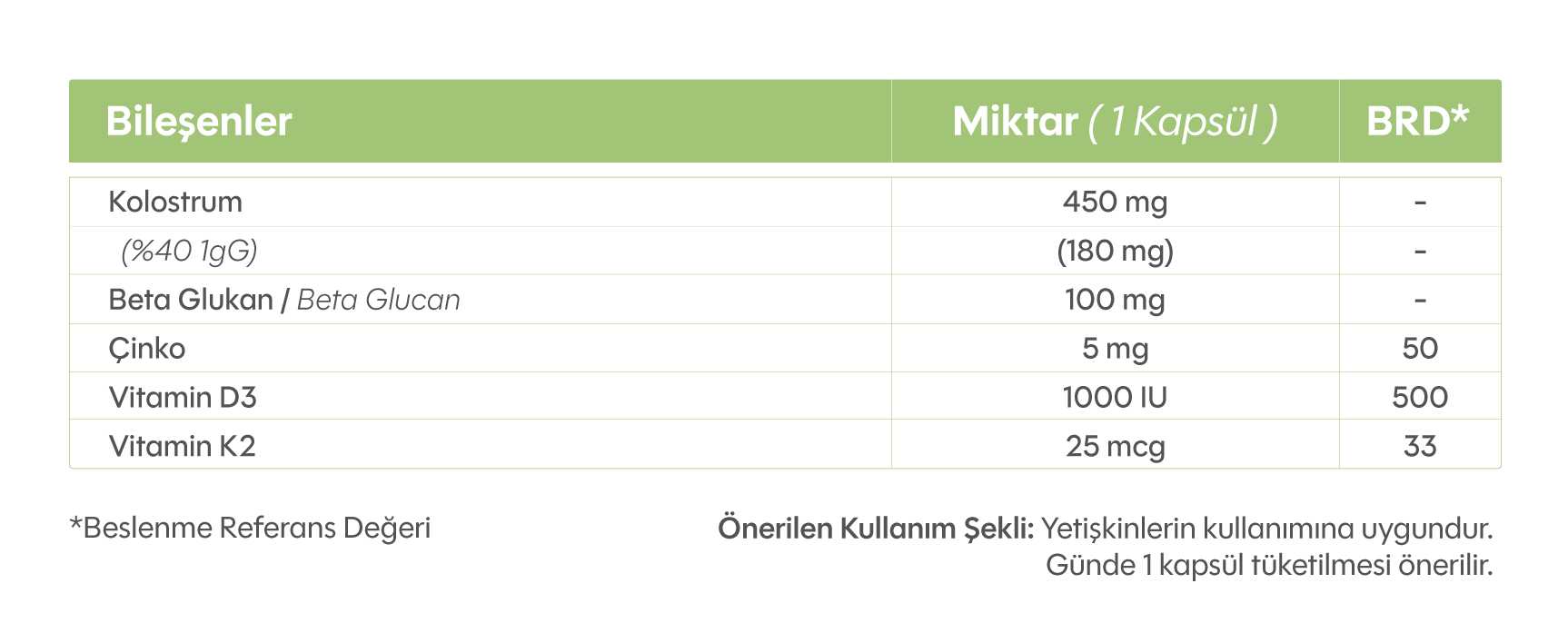 Suda Colostrum Forte içerisinde %40 kolostrum, B-glukan, çinko, vitamin D ve vitamin K bulunduran yetişkinler için geliştirilmiş bir gıda takviyesidir.