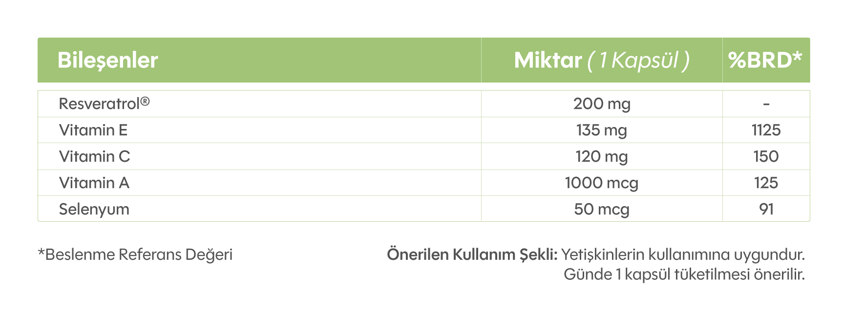 Suda Resveratrol içerisinde resveratrol, vitamin e, vitamin c, vitamin a ve selenyum bulunduran yetişkinler için geliştirilmiş bir gıda takviyesidir.