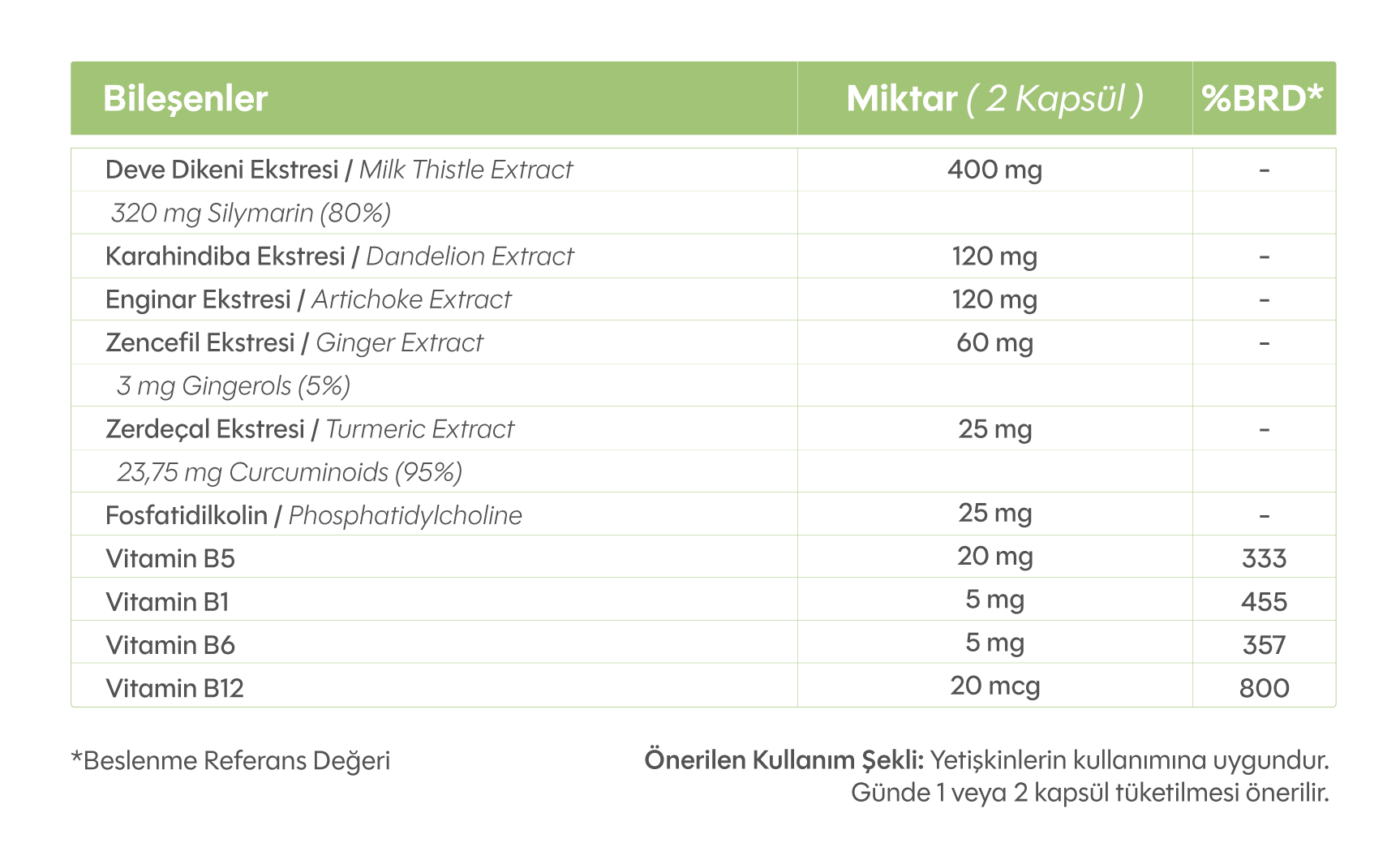 Suda Livaxine Milk Thistle Extrac milk thistle, kara hindiba, enginar, ginger, turmeric, fosfatidilkolin, vitamin b5, vitamin b1, vitamin b6 ve vitamin b12 bulunduran yetişkinler için geliştirilmiş bir gıda takviyesidir.
