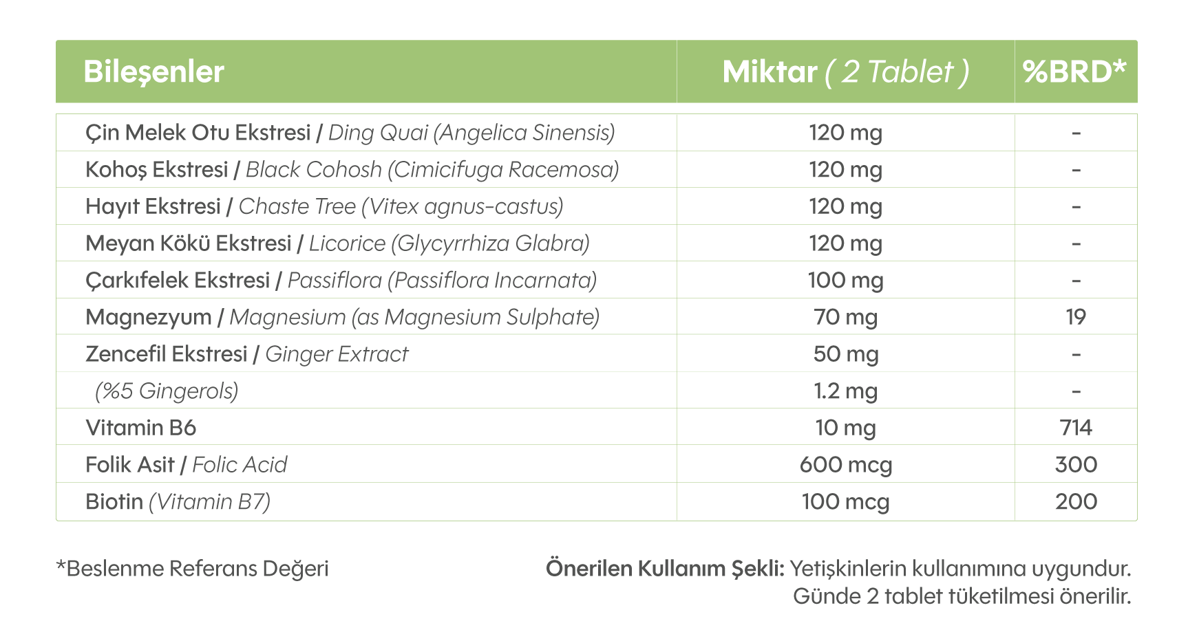 Suda Menowell Women’s Formula içerisinde dong quai, black cohosh, hayıt , meyan kökü, passiflora, magnezyum, ginger, vitamin b6, folik asit ve biotin bulunduran, yetişkin kadınlar için geliştirilmiş bir gıda takviyesidir.