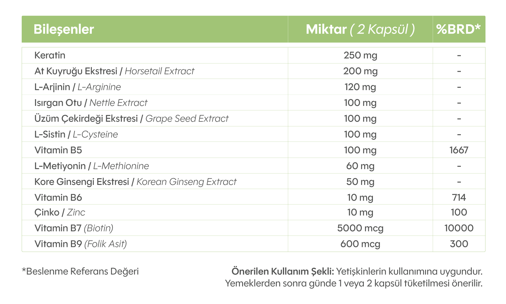 Suda Hare Care içerisinde keratin, at kuyruğu, l-arjinin, ısırgan, üzüm çekirdeği, l-sistein, vitamin b5, metiyonin, panax ginseng, vitamin b6, çinko, vitamin b7 ve vitamin b9 bulunduran yetişkinler için geliştirilmiş bir gıda takviyesidir.