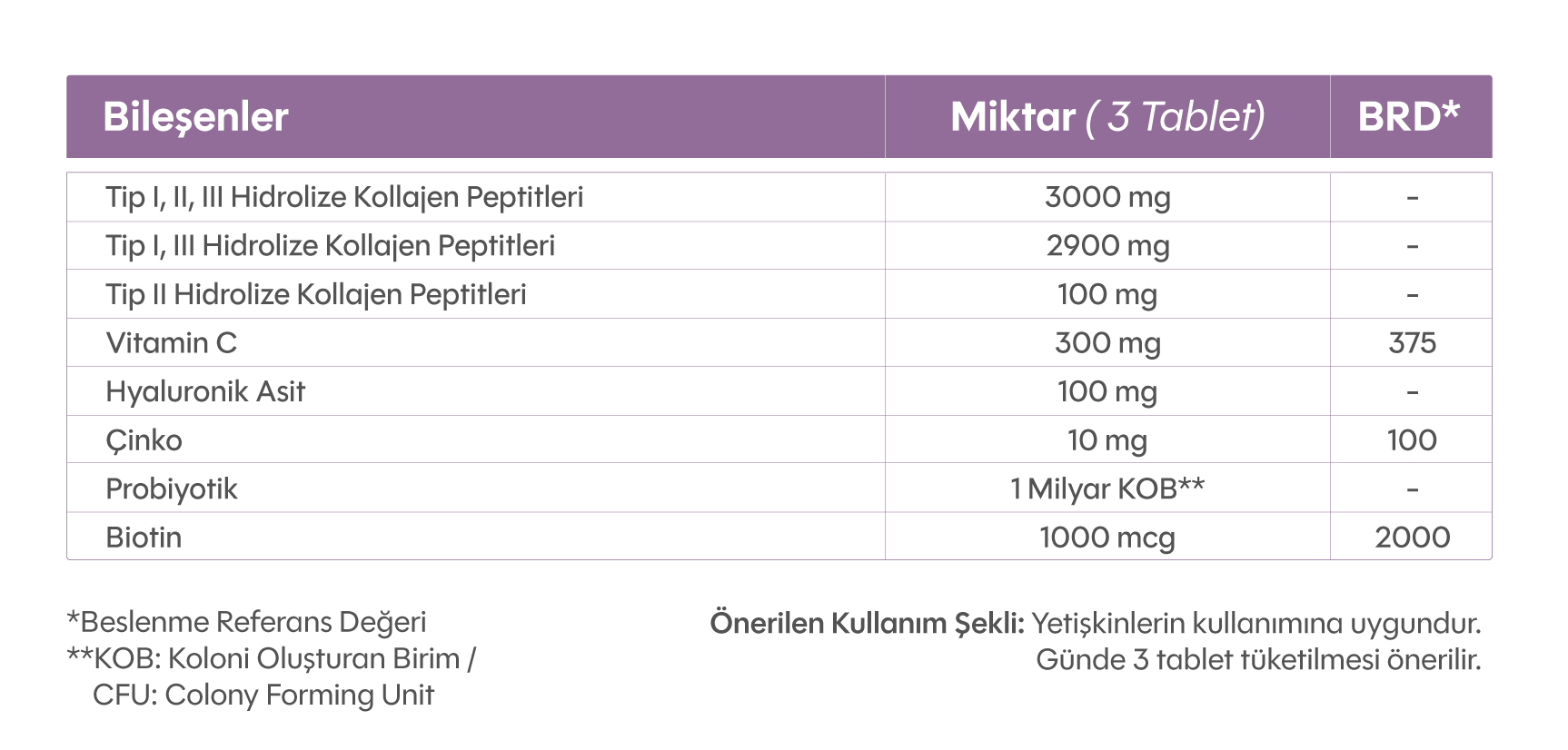Suda Multiform Tablet içerisinde tip I-II-III kollajen, hyaluronik asit, çinko, biotin ve 1 milyar probiyotik içeren yetişkinler için geliştirilmiş bir gıda takviyesidir.