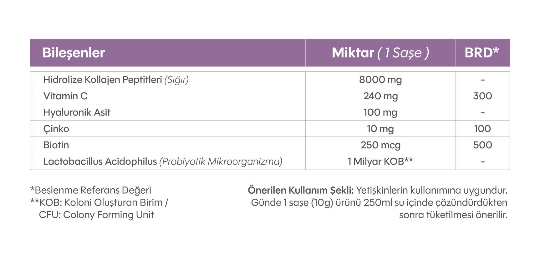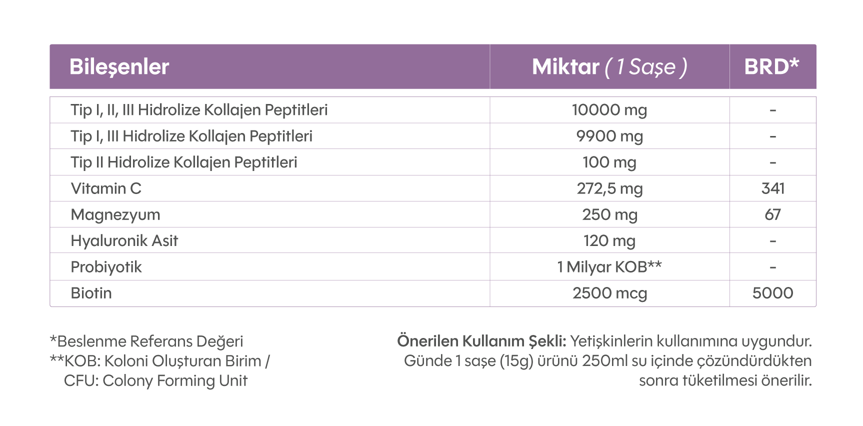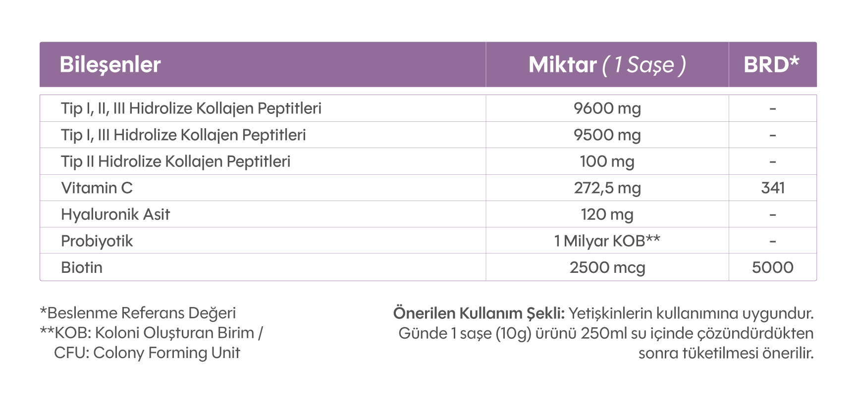 Suda Multiform Aromasız Sachet içerisinde tip I-II-III kollajen, hyaluronik asit, çinko, biotin ve 1 milyar probiyotik içeren aromasız yetişkinler için geliştirilmiş bir gıda takviyesidir.