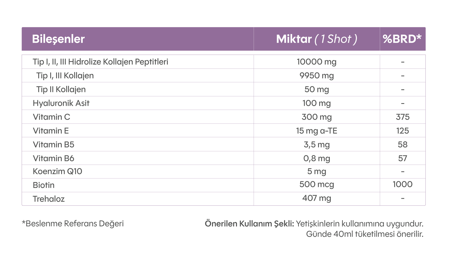 Suda Multiform Peach Shot içerisinde tip I-II-III kolajen, hyaluronik asit, biotin ve koenzim Q-10 içeren şeftali aromalı yetişkinler için geliştirilmiş bir gıda takviyesidir.