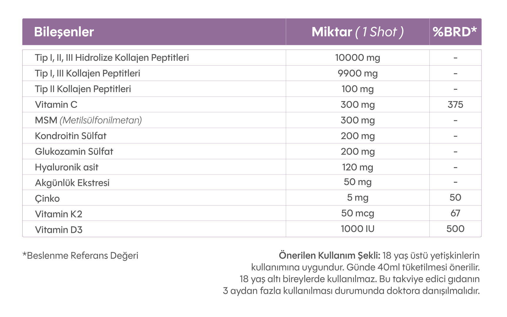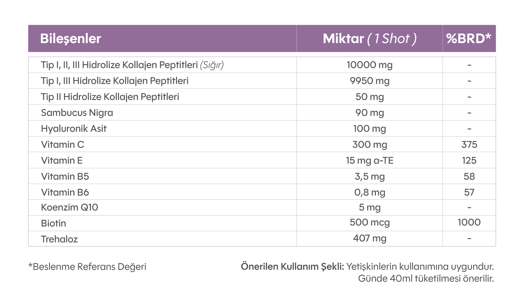 Suda Multiform Sambucus Shot içerisinde tip I-II-III kolajen, sambucus, hyaluronik asit, biotin ve koenzim Q-10 içeren vişne aromalı yetişkinler için geliştirilmiş bir gıda takviyesidir.
