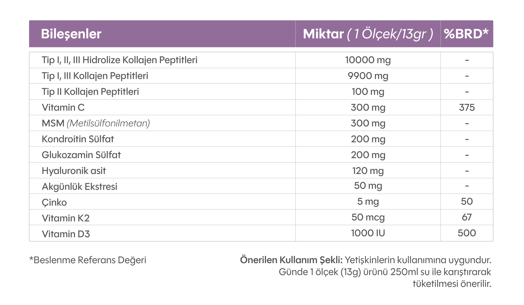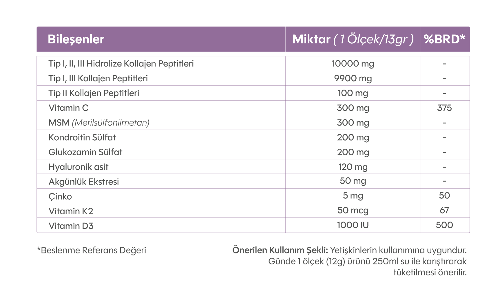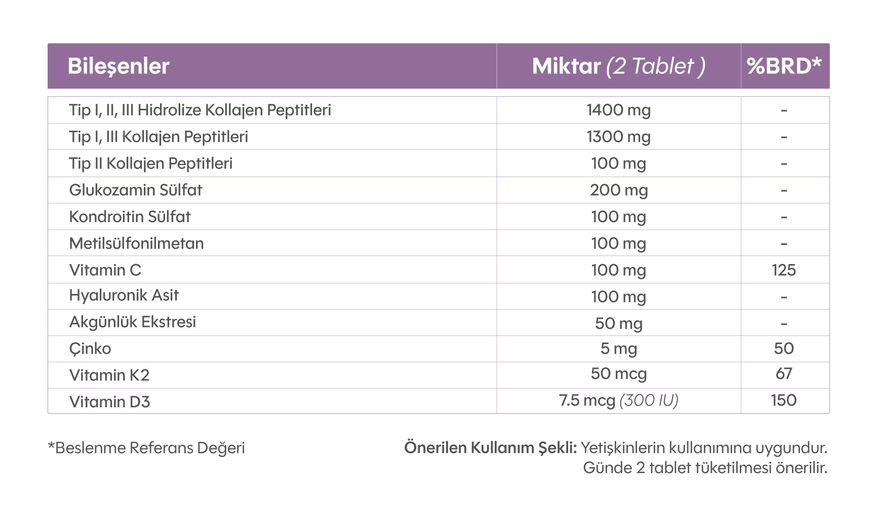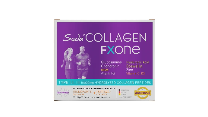Suda Multiform FXONE Tablet içerisinde tip I-II-III kolajen, hyaluronik asit, glukozamin, kondroitin, msm, boswella, vitamin K2 ve vitamin D3 içeren yetişkinler için geliştirilmiş bir gıda takviyesidir.