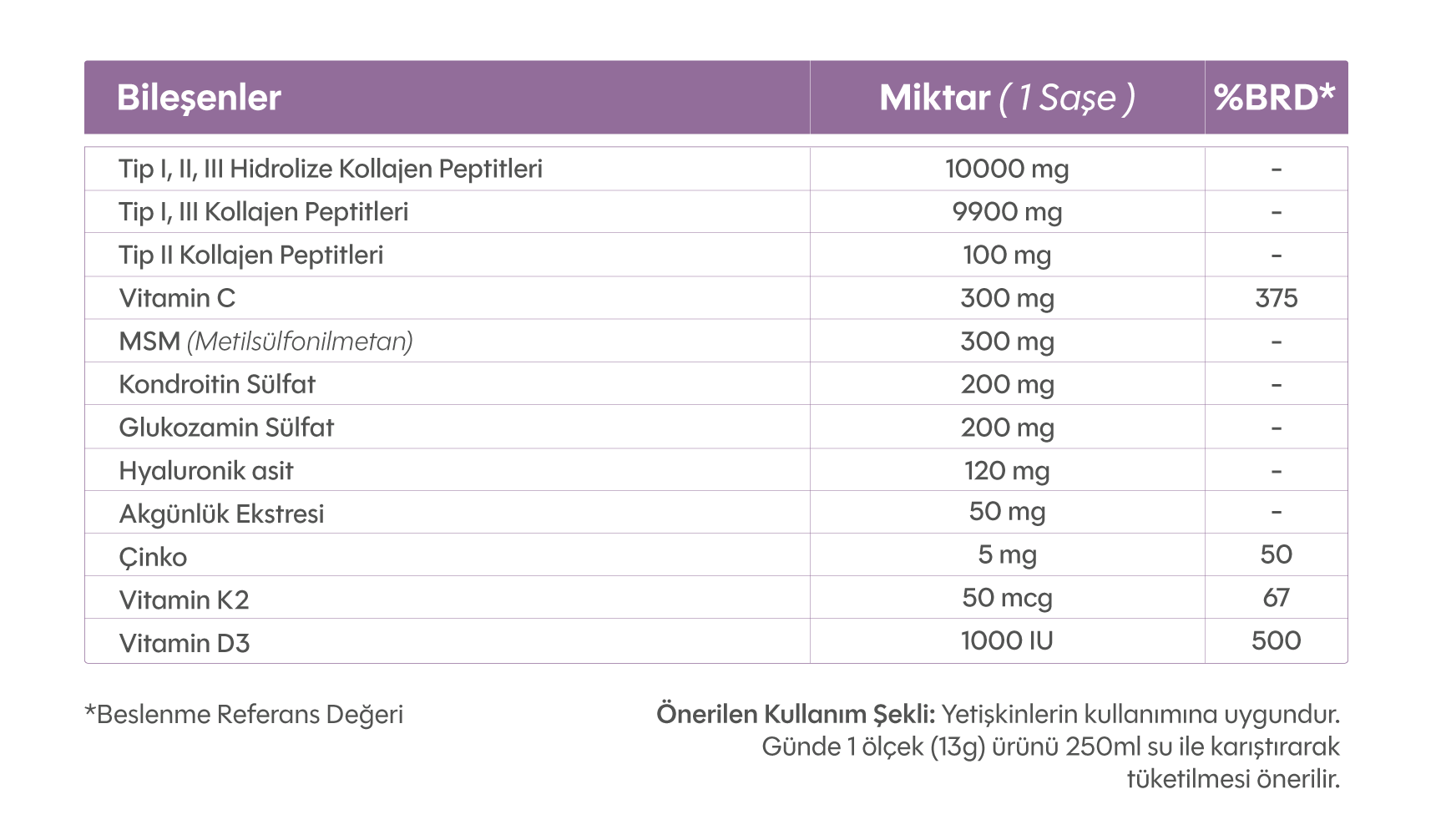Suda Multiform FXONE Apple Sachet içerisinde tip I-II-III kolajen, hyaluronik asit, glukozamin, kondroitin, msm, boswella, vitamin K2 ve vitamin D3 içeren aromasız yetişkinler için geliştirilmiş bir gıda takviyesidir.