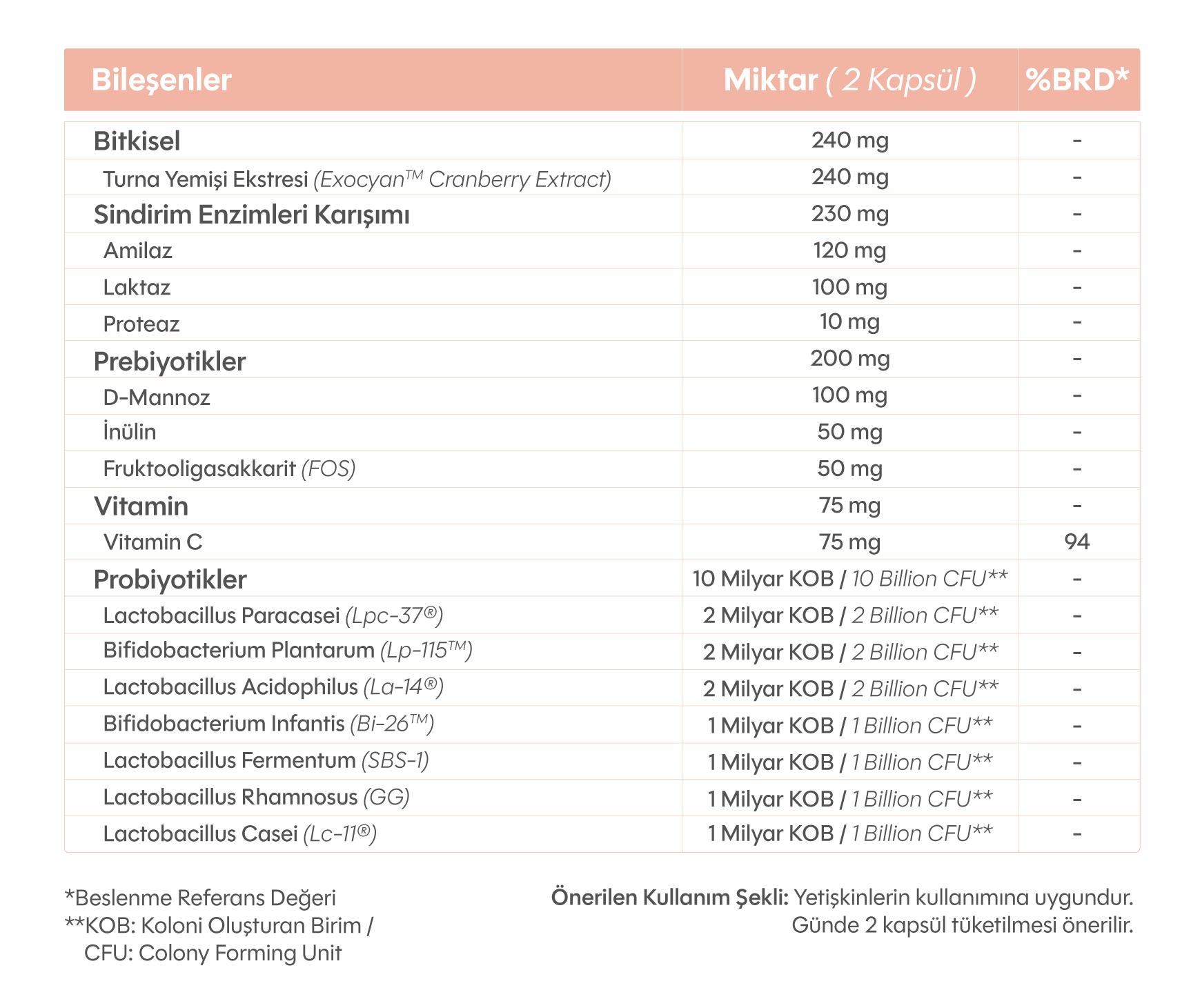 Suda Berrybiotic Only Women’s Care içerisinde, turna yemişi ekstresi, amilaz, laktaz, proteaz, prebiyotik ve toplam 10 milyar probiyotik içeren yetişkin kadınlar için geliştirilmiş bir gıda takviyesidir.