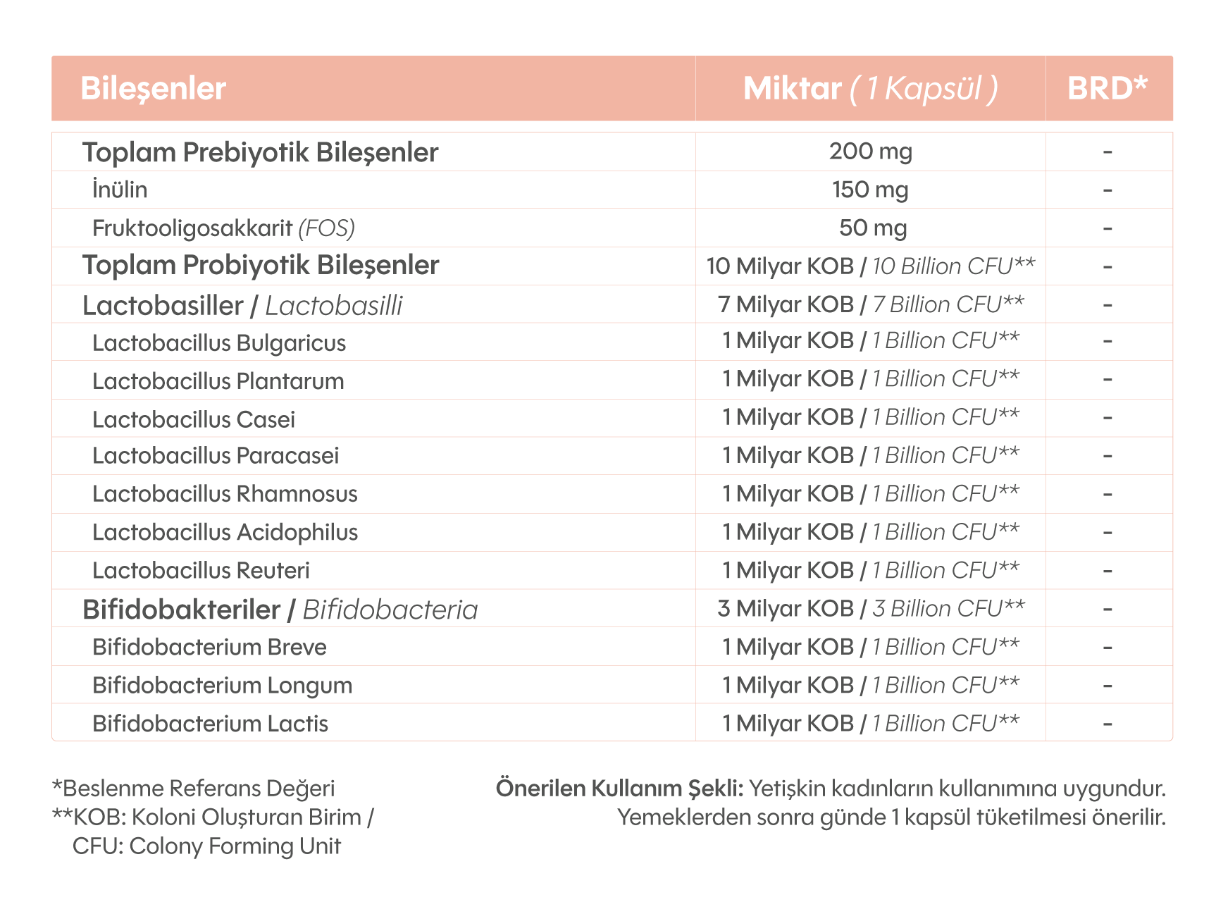 Suda Fembiotic Women’s Daily Care içerisinde prebiyotik ve toplam 10 milyar probiyotik içeren yetişkin kadınlar için geliştirilmiş bir gıda takviyesidir.