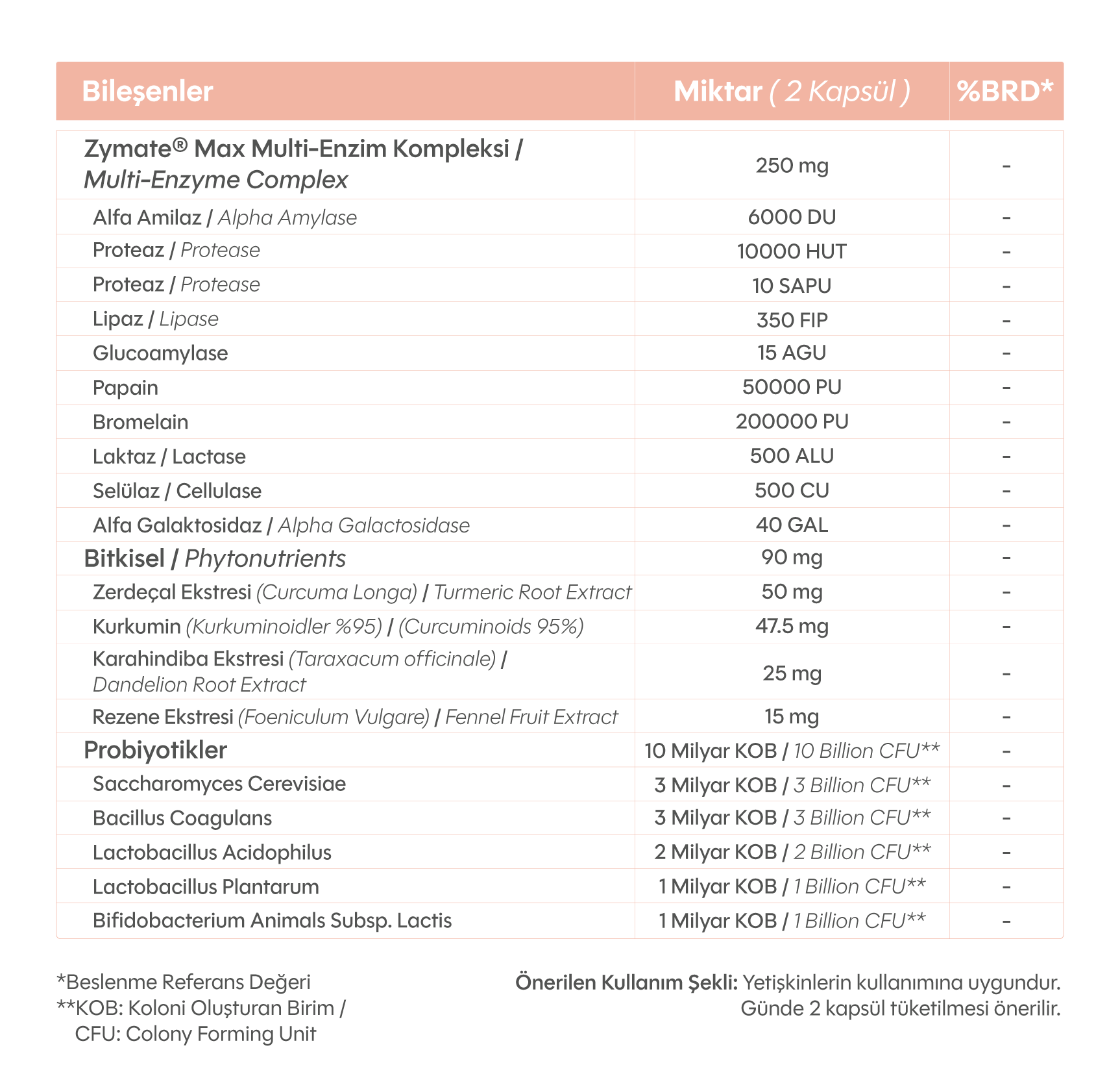 Suda Digestobiotic Digestive Balance içerisinde amilaz, proteaz, lipaz, glukomilaz, papain, laktaz, selülaz ve alfa galaktosidaz enzimlerini, ananastan elde edilen ve proteinleri sindiren enzim olan bromelaini, toplam 10 milyar probiyotik içeren yetişkinler için geliştirilmiş bir gıda takviyesidir.