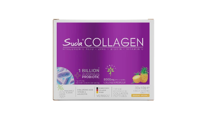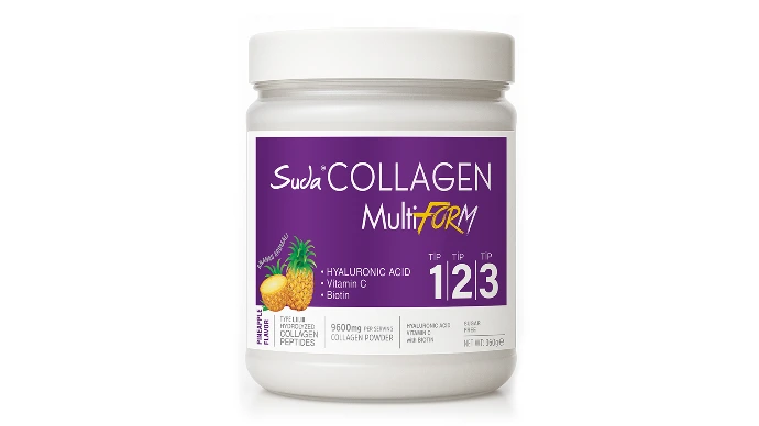 Suda Multiform Pineapple Powder içerisinde tip I-II-III kollajen, hyaluronik asit, çinko, biotin ve 1 milyar probiyotik içeren ananas aromalı yetişkinler için geliştirilmiş bir gıda takviyesidir.