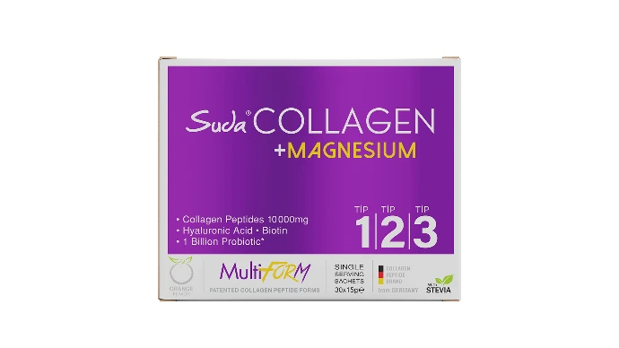 Suda Multiform + Magne Sachet içerisinde tip I-II-III kollajen, hyaluronik asit, magnezyum ve 1 milyar probiyotik içeren yetişkinler için geliştirilmiş bir gıda takviyesidir.